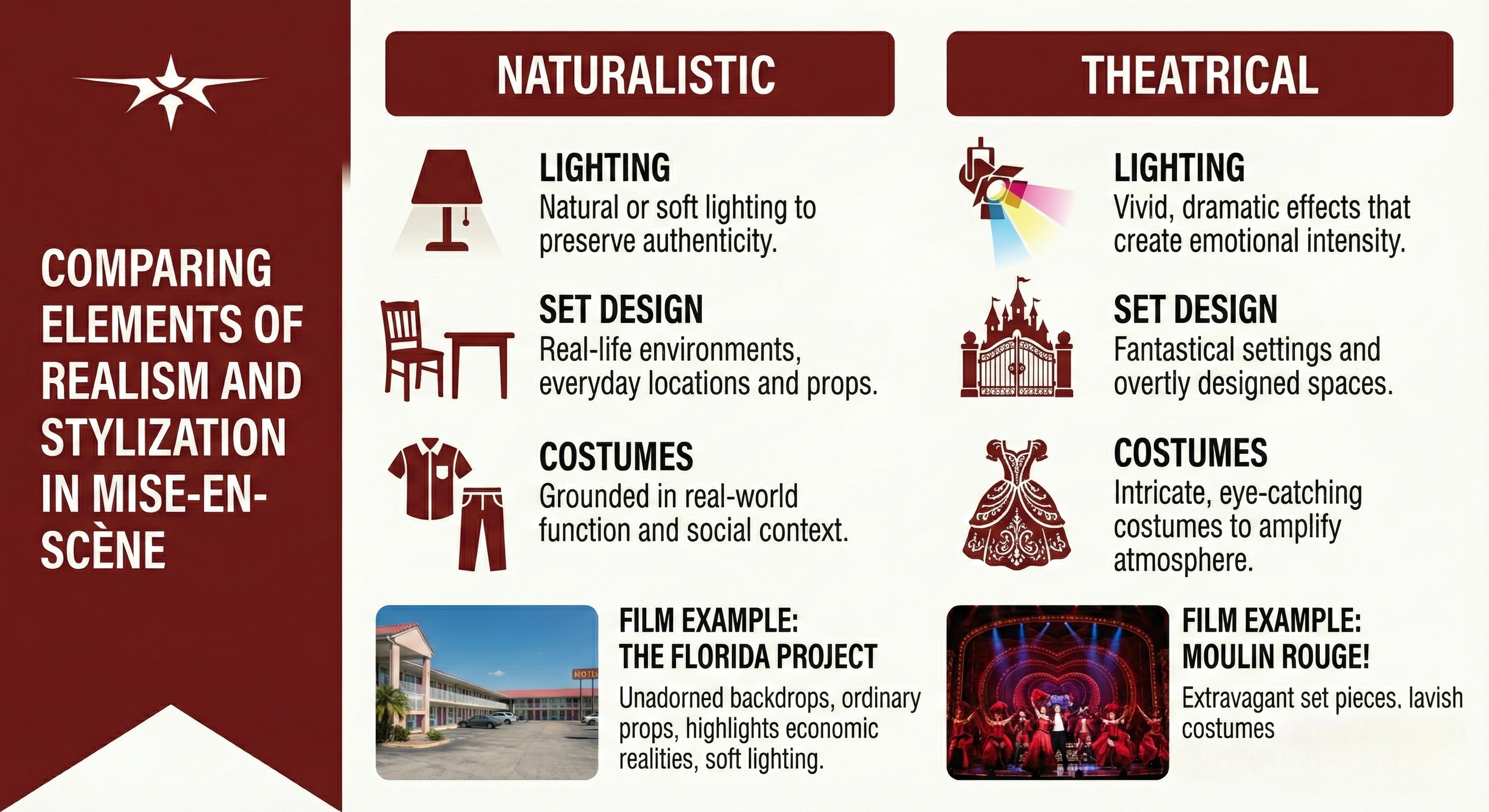 Naturalistic and theatrical mise-en-scène represent two ends of a spectrum through which filmmakers can present visual storytelling. These approaches differ significantly in design choices, mood, and the relationship they create between the film and the audience. By analyzing these styles, viewers and filmmakers alike can gain insight into how visual elements shape the impact and message of a film.
