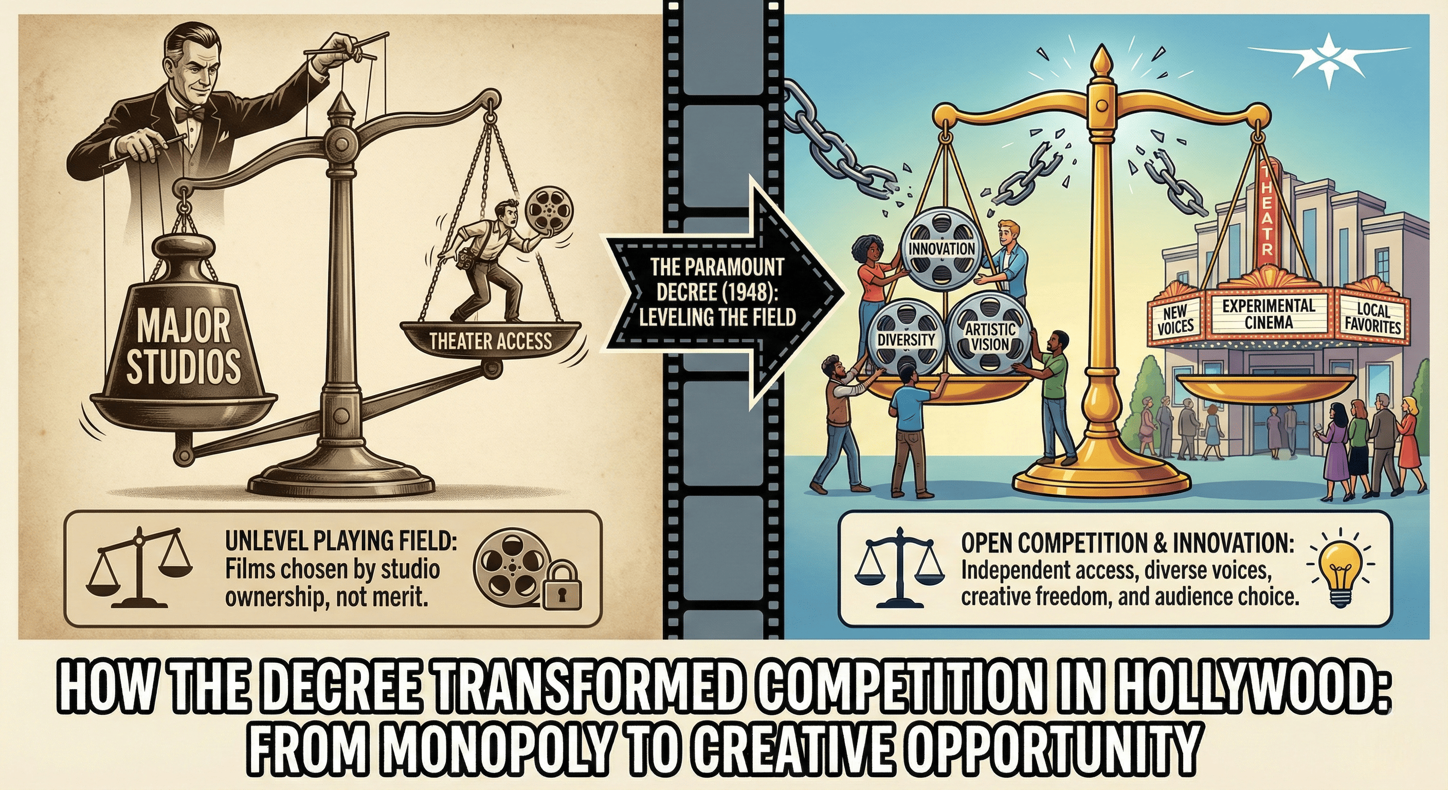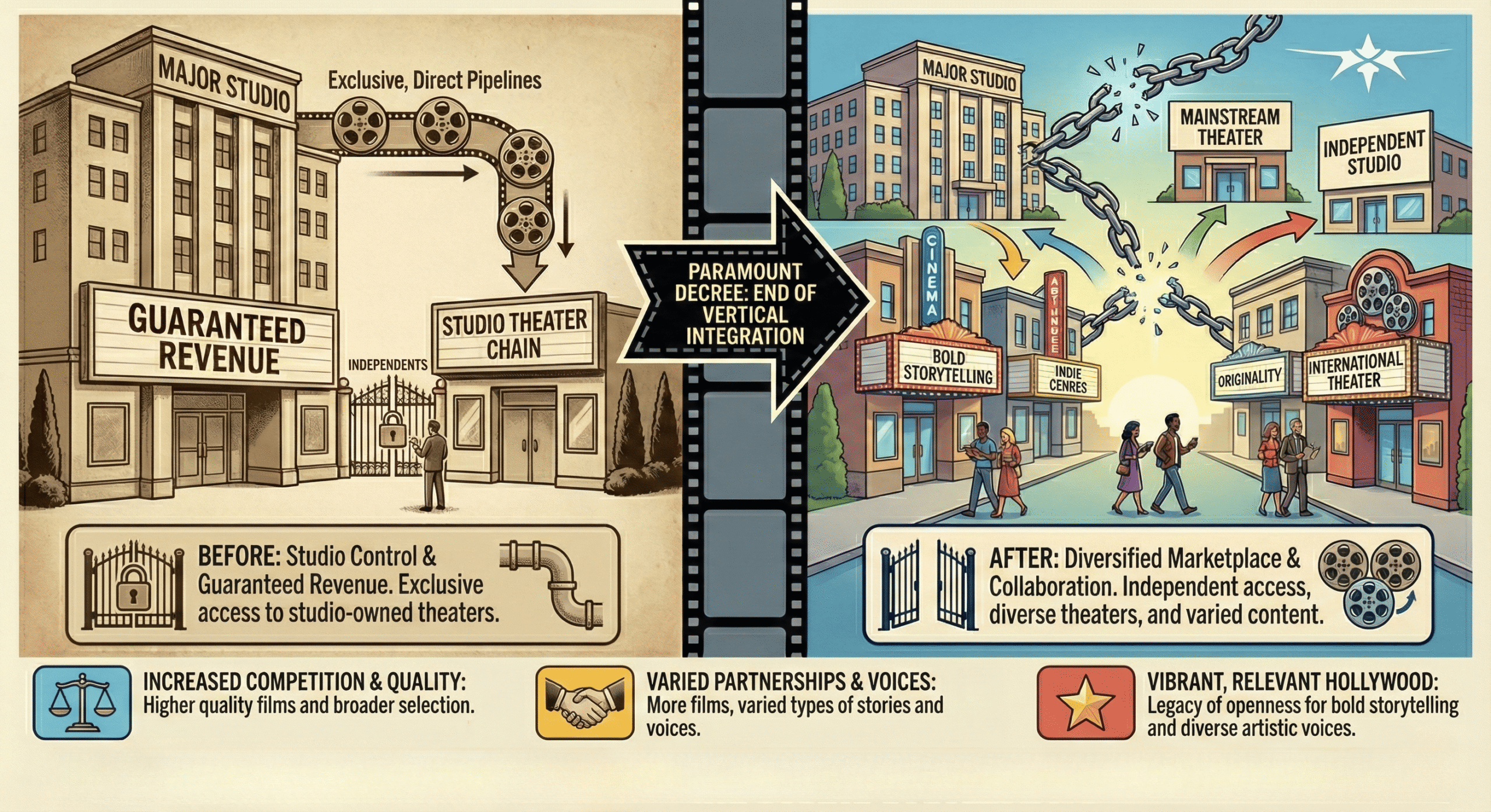 Ultimately, the Paramount Decree reshaped Hollywood into a hub for creative opportunity. The dismantling of vertical integration directly sparked a move toward more open, competitive, and artistically adventurous filmmaking. It encouraged diversity in both the types of films made and the people making them.